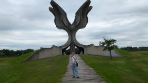 Odlazimo do kamenog cvijeta – skulpture arhitekta Bogdana Bogdanovića. Ovo obilježje je izgrađeno u spomen na žrtve stradale u koncentracijskom logoru Jasenovac u vrijeme WW2. Dok se približavamo kamenom cvijetu, vidim dvojicu turista od kojih jedan nosi jaknu sa oznakom Czech republik. Momci se zovu Pavol i Tomaš i dolaze iz grada Opava, na sjeveru prema poljskoj granici. Ima i drugih stranih turista pa tako i cijeli jedan autobus Engleza, Kineza i ostalih nacija. Posjećujemo i muzej gdje se mogu pročitati potresna svjedočanstva preživjelih žrtava.